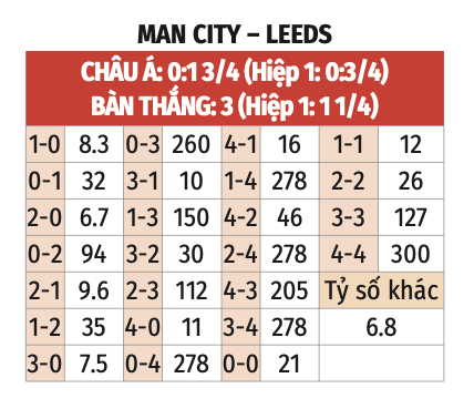 - Tổng bàn thắng là số lẻ: 3/4 trận gần nhất của Man City có tổng bàn thắng là số lẻ. 4/6 trận gần nhất của Leeds có kịch bản tương tự. Trận này nhiều khả năng số lần lưới rung sẽ không chia hết cho 2.