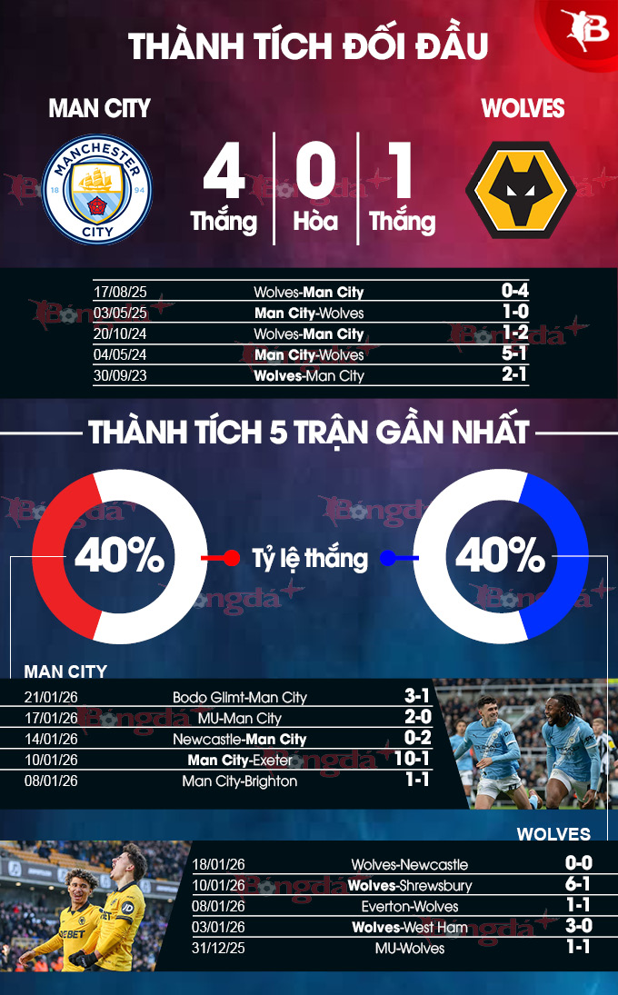 Man City gặp khá nhiều bất lợi ở cuộc đón tiếp Wolves tại sân Etihad lần này. Mặc dù chỉ thua một trong 10 trận gần nhất tại Ngoại hạng Anh (thắng 6, hòa 3), nhưng đội bóng của Pep Guardiola lại không thắng 4 trận gần đây nhất (hòa 3, thua 1). Lần gần nhất họ trải qua chuỗi trận không thắng dài hơn là vào giai đoạn từ tháng 10 đến tháng 11/2009. Khi ấy, The Citizens trải qua 7 trận hòa liên tiếp dưới thời Mark Hughes.