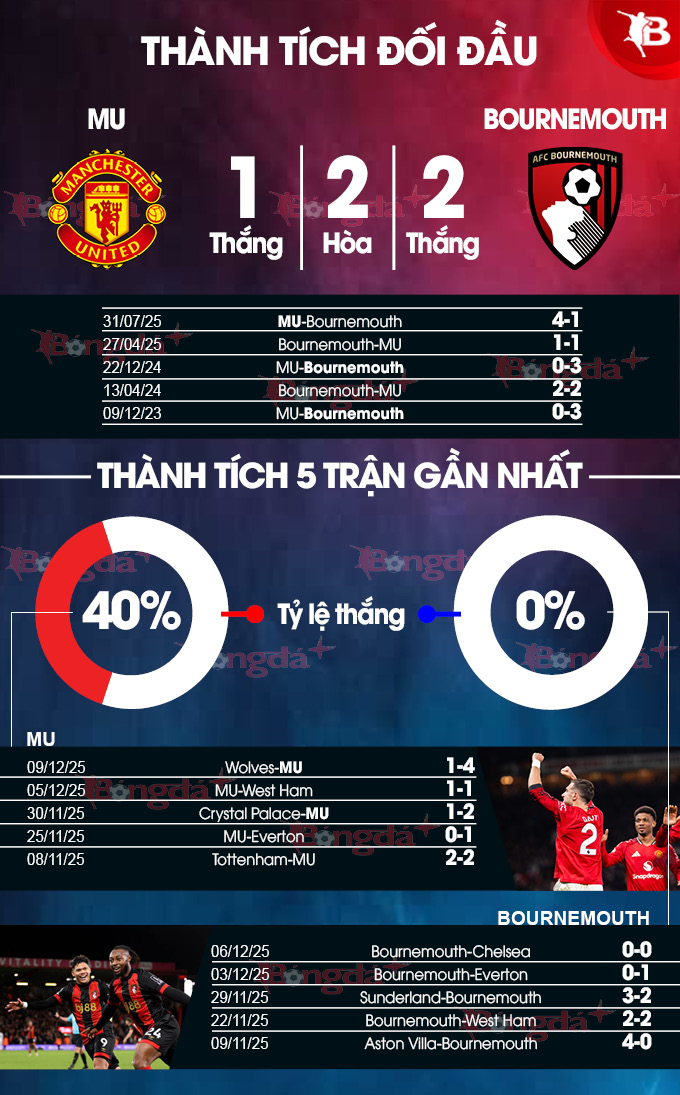 Tuy vậy, Bournemouth cũng có những lý do riêng để tin rằng họ sẽ có màn trình diễn ấn tượng tại Nhà hát của những giấc mơ. Việc toàn thắng ở 2 chuyến làm khách gần nhất tại Old Trafford và chuỗi 4 trận bất bại (2 thắng, 2 hòa) trên mọi đấu trường gần đây trước MU (trừ giao hữu) cùng “chìa khóa” Antoine Semenyo sẽ giúp đội bóng của HLV Andoni Iraola giành 1 điểm quan trọng từ đội chủ nhà.