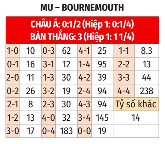 • Bournemouth ghi bàn hiệp 1: Bournemouth ghi ít nhất 1 bàn trong hiệp 1 ở 4/5 cuộc đối đầu gần nhất, ở 5/7 chuyến làm khách gần đây tại sân Old Trafford. Ngoài ra, Bournemouth cũng xuyên thủng lưới đối phương ít nhất 1 lần ở 5/6 chuyến xa nhà gần đây. Trận này khó có ngoại lệ.