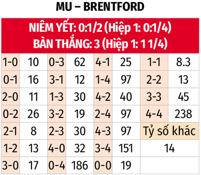 - Từ 3 bàn thắng trở lên: 5/6 trận gần đây của MU cùng 4/6 trận vừa qua của Brentford đều xuất hiện ít nhất 3 bàn thắng được ghi. 4/5 trận đối đầu gần nhất giữa đôi bên cũng xuất hiện tối thiểu 3 tình huống ghi bàn.