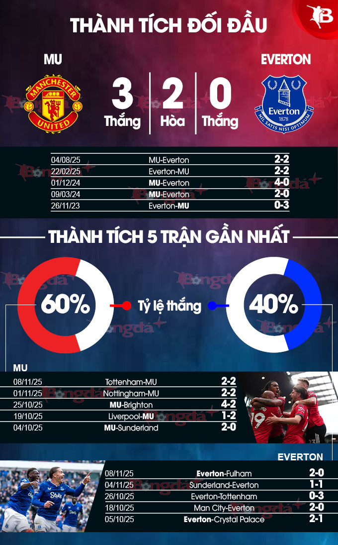 - Tối thiểu 2 bàn hiệp 1: Cả 4 trận gần đây giữa MU và Everton đều có 2 bàn được ghi trong hiệp 1. 3 trận sân nhà vừa qua của Quỷ đỏ cũng diễn ra theo kịch bản này.