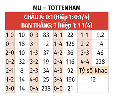 - Tối thiểu 1 bàn hiệp 1: 17/20 trận gần nhất của MU có tối thiểu 1 lần lưới rung hiệp 1. 16/20 trận gần nhất của Tottenham có kịch bản tương tự. NHM nên đợi sau 15 phút đầu rồi tin tưởng tỷ lệ nhiều bàn hiệp 1.