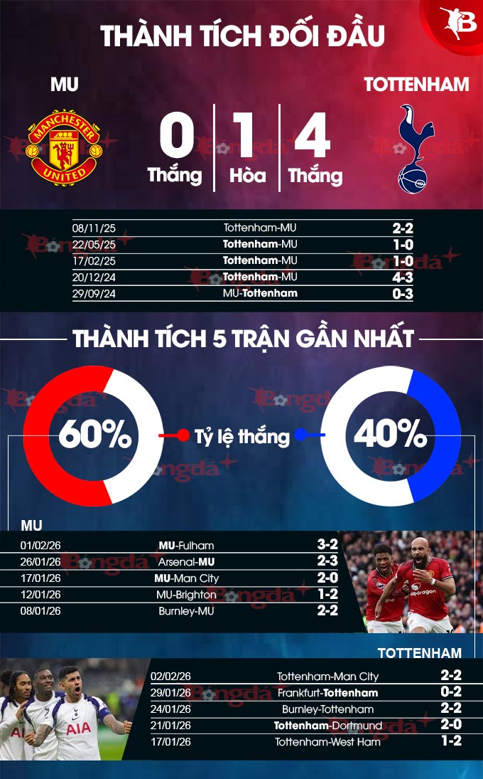 Phong độ của Tottenham cũng rất tệ khi họ không thắng được trận nào sau 7 trận ở giải nội địa Anh từ đầu năm 2026, thua 3. Với phong độ này, Spurs nhiều khả năng sẽ nhận thất bại trước một MU đang rất hưng phấn.