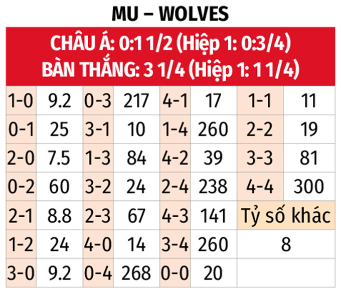 - MU thắng châu Á hiệp 1: Trên sân nhà, MU đang nhập cuộc rất ấn tượng với 2 trận liên tiếp gần đây thắng châu Á ngay trong hiệp đầu. Với Wolves, 7/10 trận sân khách tại Ngoại hạng Anh chứng kiến họ sớm để thua trước giờ nghỉ.