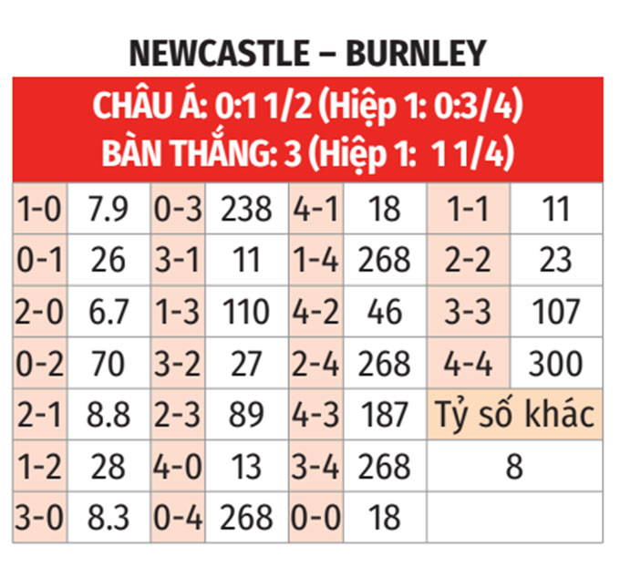 - Tỷ số chẵn: 3/4 trận sân nhà gần đây của Newcastle đều kết thúc với tỷ số chẵn. 7/8 trận Newcastle tiếp đón Burnley gần nhất cũng diễn ra theo đúng kịch bản này.
