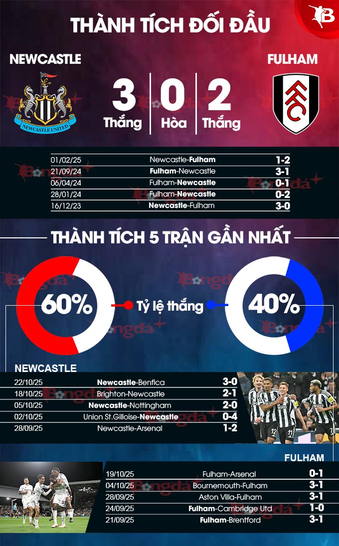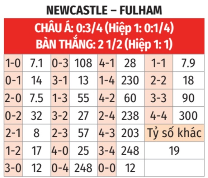 - Lẻ bàn thắng: 5/6 lần đối đầu giữa 2 đội gần đây tại giải Ngoại hạng Anh kết thúc với tổng bàn thắng là số lẻ. 6/7 trận sân nhà gần đây của Newcastle và trận đấu mới nhất của Fulham xảy ra tình trạng tương tự.