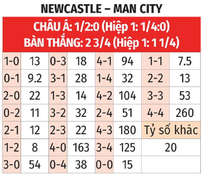 - Nhiều bàn thắng: Những trận đấu có sự góp mặt của Newcastle thời gian qua thường diễn ra với thế trận rất cởi mở và hấp dẫn, khi 5/7 trận gần đây đều có từ 3 bàn thắng trở lên. 4 trận liên tiếp của Man City cùng 4/6 trận đối đầu gần nhất trên sân St. Jame's Park cũng có tối thiểu 3 pha làm bàn.