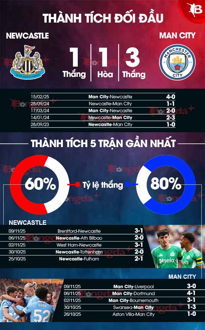 Đội bóng của HLV Pep Guardiola có thành tích gần đây nổi bật trước Newcastle và họ hành quân đến St James' Park với thành tích bất bại trong 12 lần gặp nhau gần nhất tại đấu trường Ngoại hạng Anh với 9 chiến thắng và 3 trận hòa.