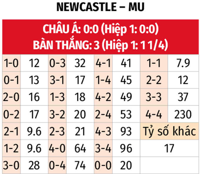 - Chờ 1 hòa hiệp 1 cổ vũ mưa bàn thắng: 12 trận liên tiếp gần đây của Newcastle đều có bàn thắng trong hiệp 1, với 9 trận có từ 2 bàn trở lên. 4/6 trận vừa qua của MU cùng 5/6 trận đối đầu gần nhất cũng xuất hiện tối thiểu 1 bàn trước giờ nghỉ.