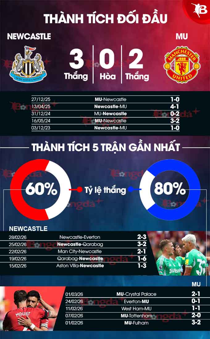- Nhiều bàn thắng: 9 trận liên tiếp gần đây của Newcastle cùng 11/14 trận sân khách vừa qua của MU đều có ít nhất 3 bàn thắng được ghi. Trận đối đầu gần nhất trên sân St James' Park đã có tới 5 lần lưới rung.