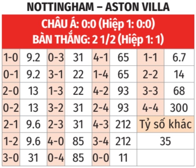 - Tối thiểu 1 bàn hiệp 1: 8/10 lần gặp giữa 2 đội gần đây đều có từ 1 bàn thắng trở lên trong hiệp 1. Tình trạng tương tự xảy ra ở 6/8 trận gần đây của Nottingham Forest và 3 trận vừa qua của Aston Villa.