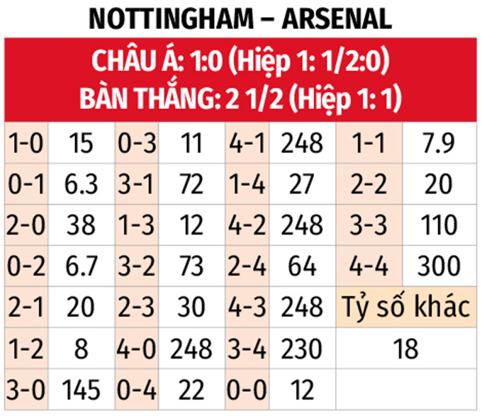 - Arsenal thắng cả hai hiệp đấu: Việc Arsenal thường xuyên kiểm soát trận đấu từ sớm, kết hợp với việc Nottingham gần đây thường để thủng lưới trước trên sân nhà, ủng hộ kịch bản đội khách tạo lợi thế trước khi kiểm soát hiệp hai.