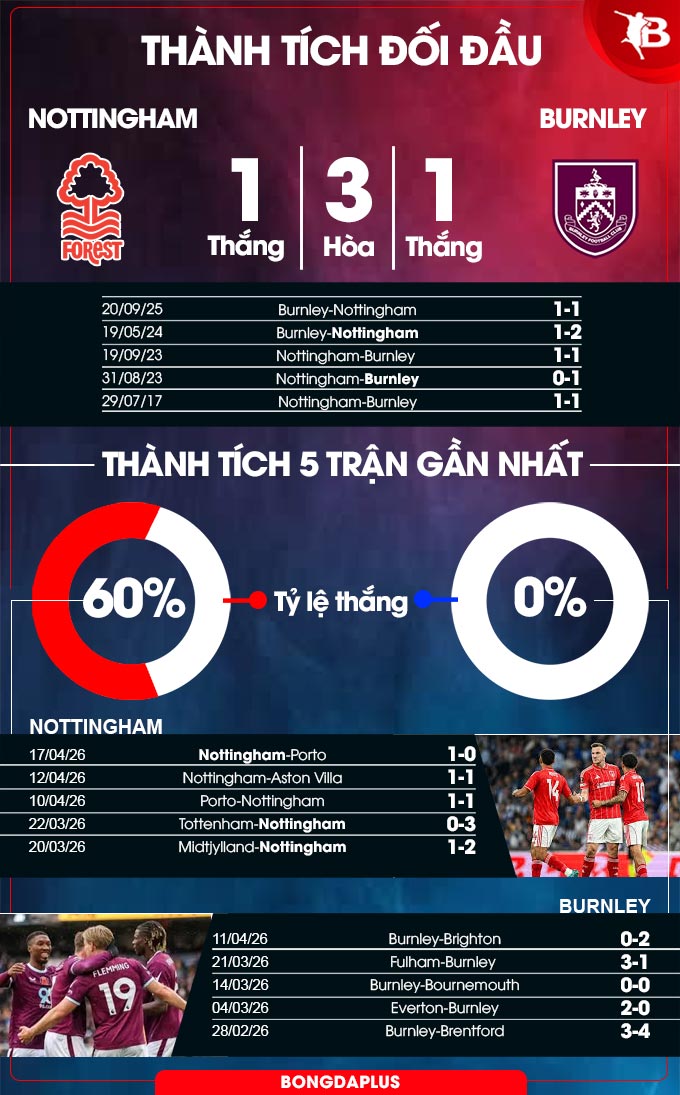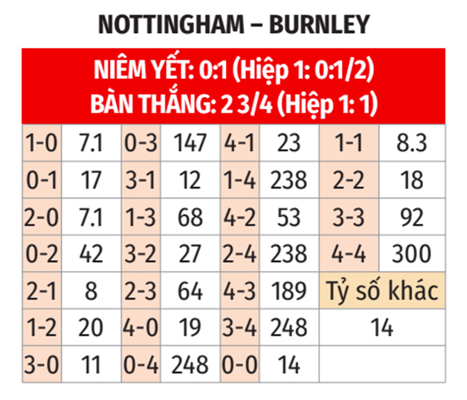 - Chẵn bàn thắng: 11/15 cuộc đối đầu gần nhất, 8/11 trận gần đây của Nottingham tại Premier League và 5/6 trận vừa qua của Burnley đều khép lại với tổng bàn thắng là chẵn.