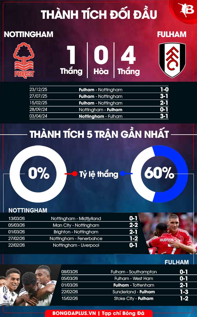 Cần nhấn mạnh rằng, Fulham đang có thành tích đối đầu rất tốt trước Nottingham. Cụ thể, đội bóng thành London đã thắng 6 trong 7 trận đấu tại Premier League gặp Nottingham (thua 1), tỷ lệ thắng cao nhất của họ trước bất kỳ đội nào mà họ đã đối đầu hơn hai lần (86%).