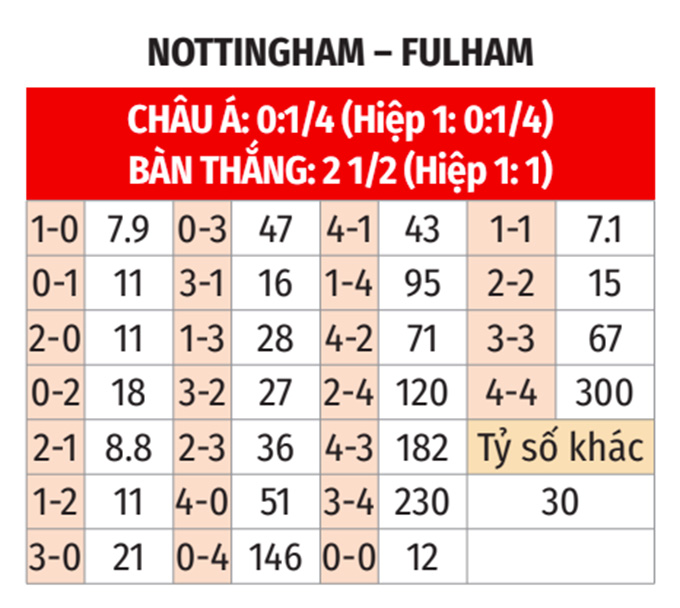 - Lẻ bàn thắng: 6/9 cuộc đối đầu gần nhất, 5/6 trận gần đây của Nottingham và 9/10 trận vừa qua của Fulham đều khép lại với tổng bàn thắng là lẻ. Hơn nữa, 8/10 chuyến làm khách gần đây của Fulham cũng có tổng bàn thắng không chia hết cho 2.