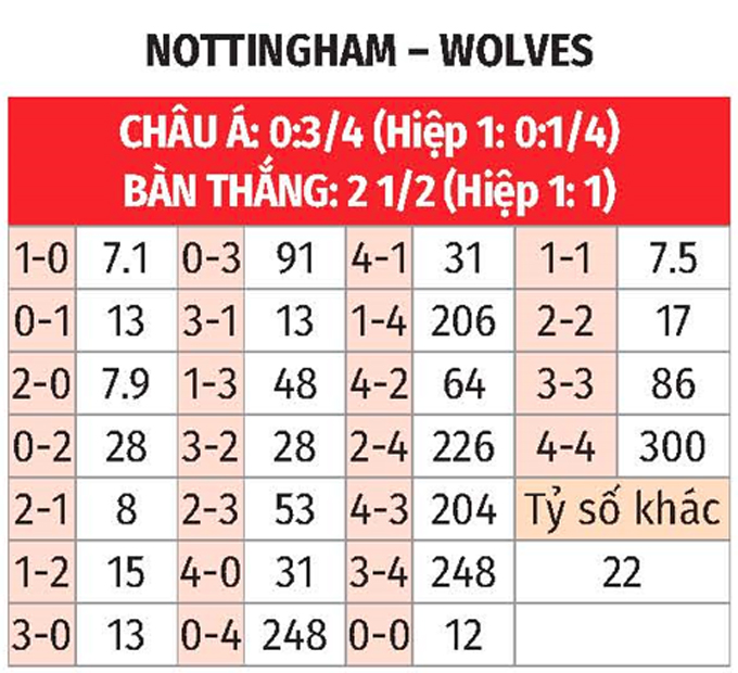 - Hai đội cùng ghi bàn: Nottingham thành công trong việc ghi bàn ở 7/9 trận gần nhất còn với Wolves là ở 6/9 trận vừa xong. Bên cạnh đó, Nottingham ghi bàn ở 5/8 trận vừa qua trên sân nhà còn với Wolves là ở 4/5 trận sân khách gần đây. Với xu hướng như vậy, khả năng cao hai đội sẽ cùng tìm được đường vào khung thành của nhau.
