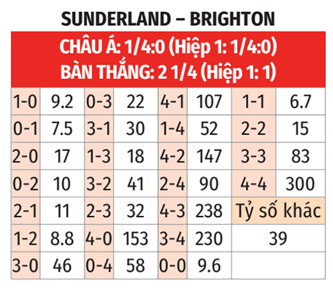 - Tối đa 2 bàn: 6/7 trận gần đây của Brighton chỉ có tối đa 2 bàn. 5/6 trận gần nhất của Sunderland số lần lưới rung cũng không hơn được 2.