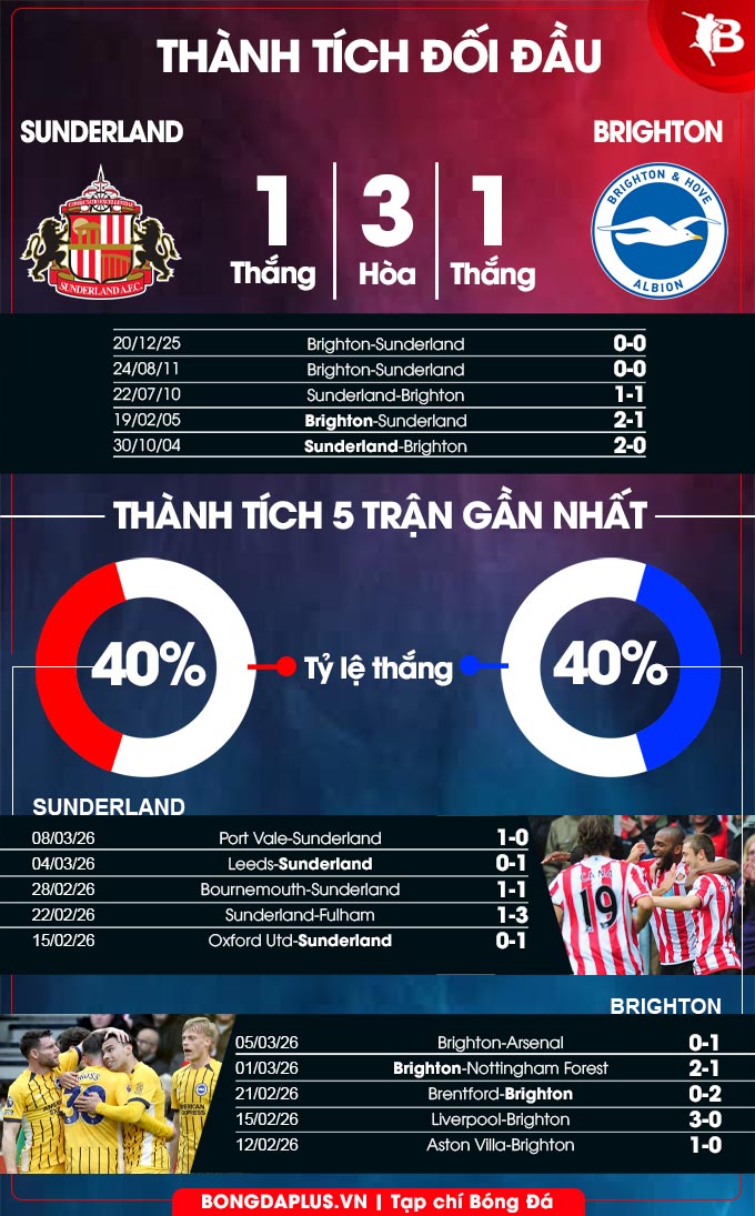 Vấn đề của Sunderland nằm ở hàng công. Từ đầu năm 2026 tới nay, đội bóng vùng Đông Bắc mới ghi 10 bàn tại Premier League – thành tích khá khiêm tốn. Tuy vậy, điểm tựa lớn của họ chính là sân nhà. Đặc biệt, Sunderland đã thắng cả 5 lần gần nhất tiếp đón Brighton tại sân The Light và bất bại trước đối thủ này suốt hơn bốn thập kỷ.