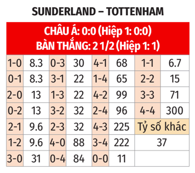 - Lưới rung cuối hiệp 1: Có ít nhất 1 bàn từ phút 16-45 trong hiệp 1 ở 7/10 cuộc đối đầu gần nhất. Hơn nữa, 11/14 trận vừa qua của Sunderland và cả 10 trận gần đây của Tottenham đều chứng kiến ít nhất 1 lần lưới rung 30 phút cuối hiệp 1. Trận này khó có ngoại lệ.