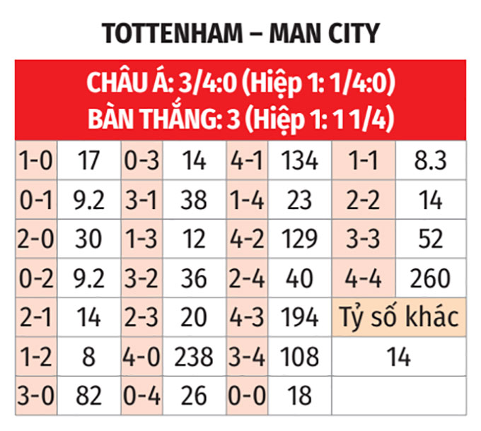 Căn cứ vào thực tế trên, rất khó để tin rằng Tottenham có thể cầm cự được với Man City đang cạnh tranh quyết liệt với Arsenal trong cuộc đua tới ngôi vô địch. Vẫn biết HLV Pep Guardiola đã nhận tới 8 thất bại trước Tottenham ở giải Ngoại hạng Anh, song với thực lực mạnh hơn thì Man City vẫn đủ khả năng khiến chuỗi trận tệ hại trên sân nhà của Spurs chưa thể dừng lại.
