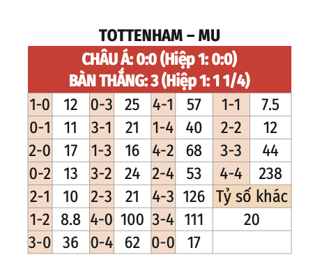 - Cả 2 đội ghi bàn: 6/10 trận sân nhà gần nhất của Tottenham ở Premier League có hiện tượng cả 2 đội cùng ghi được bàn thắng. 5/6 trận gần nhất của MU có kịch bản tương tự. MU đang chơi tấn công tốt nhưng khả năng phòng ngự thì không đáng tin cậy. Trận này cả 2 đội sẽ cùng ghi được bàn thắng.