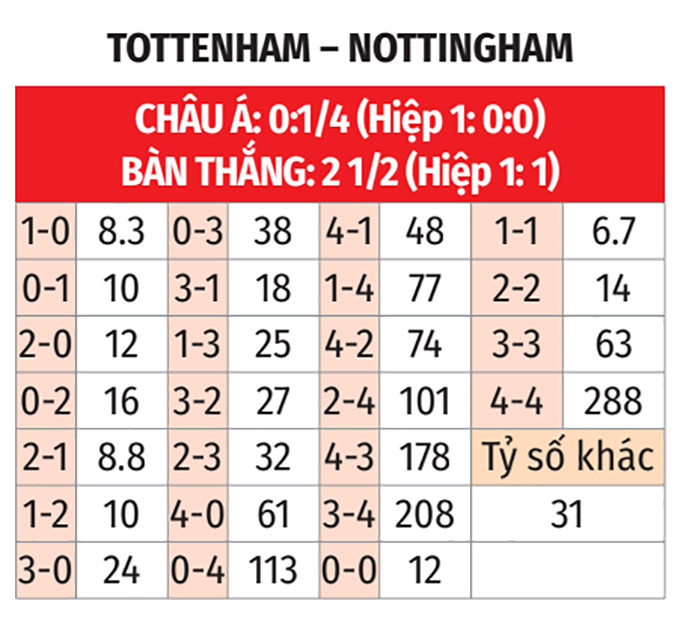 - Tối thiểu 3 bàn: 3/4 trận gần đây giữa Nottingham Forest và Tottenham đều có tối thiểu 3 bàn. Điều tương tự cũng diễn ra ở 6/7 trận vừa qua của Tottenham và 4/6 trận gần nhất của Nottingham Forest.