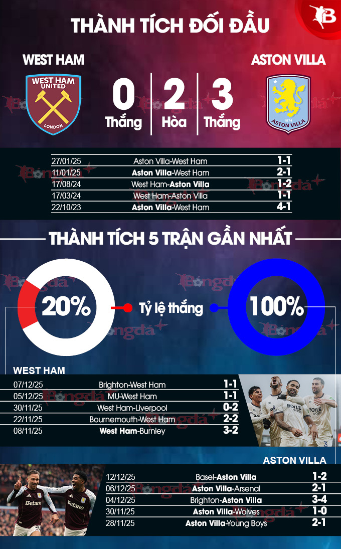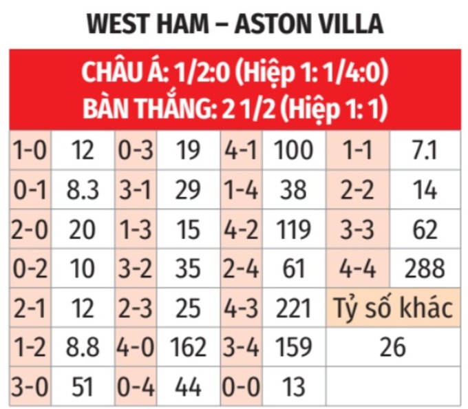 - Tối thiểu 3 bàn cả trận: 6/8 trận sân nhà gần đây của West Ham tại giải Ngoại hạng Anh đều kết thúc với tối thiểu 3 bàn thắng. Tình trạng tương tự xảy ra ở 6/7 trận gần nhất của Aston Villa.