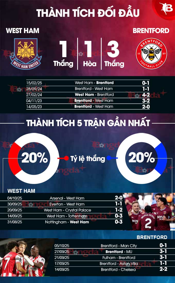 - Nhiều bàn thắng hiệp 1: 5 lần gặp giữa 2 đội gần đây đều có từ 1 bàn thắng trở lên trong hiệp 1. Tình trạng tương tự xảy ra ở 5/7 trận gần đây của West Ham và 17/18 trận mới nhất của Brentford.