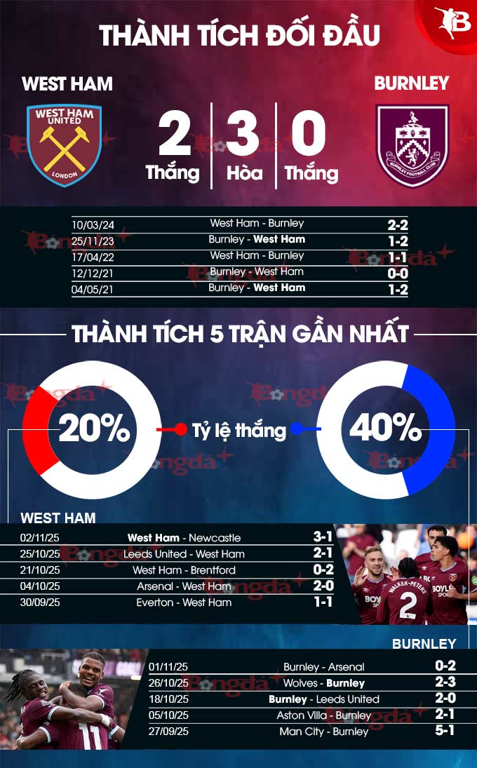 Về phần mình, Burnley mới để thua Arsenal tới 2 bàn không gỡ cuối tuần qua. Tuy nhiên, đây là kết quả hoàn toàn hợp lý chứ cũng không có gì bất ngờ, bởi Burnley phải đối mặt với Pháo thủ hiện dẫn đầu BXH nhờ chuỗi trận thắng như chẻ tre. Với việc đã thu về 6 điểm từ 3 vòng gần nhất, Burnley vẫn có lý do để tự tin khi viếng thăm sào huyệt của West Ham, đội bóng phải ngước lên mới thấy được mình.