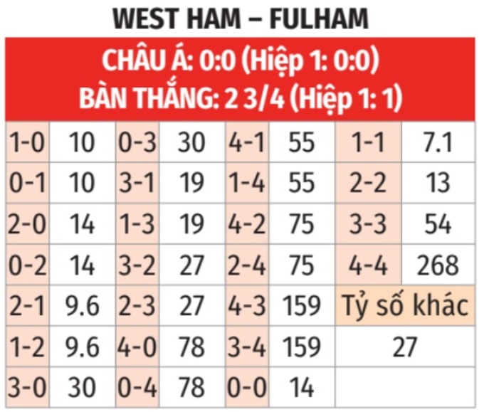 - Tối thiểu 1 bàn hiệp 1: 5/6 lần gặp giữa 2 đội gần đây đều có từ 1 bàn thắng trở lên trong hiệp 1. Tình trạng tương tự xảy ra ở 5/6 trận sân nhà gần đây của West Ham và 6 trận mới nhất của Fulham.