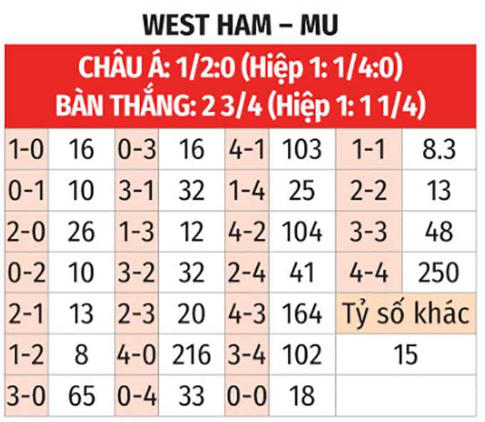 - Tối thiểu 3 bàn: 3/4 trận gần đây của West Ham đều có tối thiểu 3 bàn. 8/9 trận sân khách gần nhất của MU số lần lưới rung cũng đều chạm ngưỡng 3.
