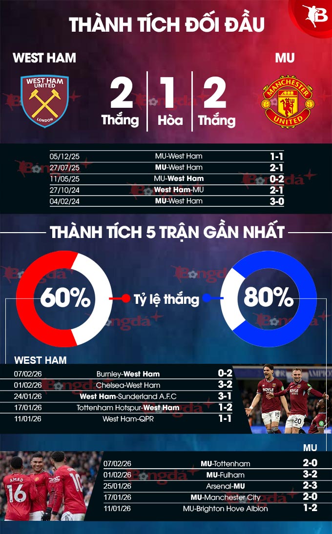 - Lưới rung cuối trận: 3/4 trận gần nhất giữa West Ham và MU có bàn thắng được ghi trong 12 phút cuối. 4/5 trận gần đây của MU bảng tỷ số vẫn cập nhật sau phút 80.