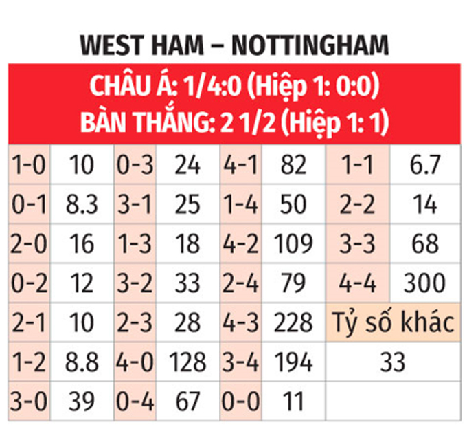 - Hai đội cùng ghi bàn: West Ham và Nottingham thành công trong việc ghi bàn ở 6/10 trận gần nhất. Bên cạnh đó, West Ham ghi bàn ở 4/6 trận vừa qua trên sân nhà còn với Nottingham là ở 4/6 trận sân khách gần đây. Với xu hướng như vậy, khả năng cao hai đội sẽ cùng tìm được đường vào khung thành của nhau.