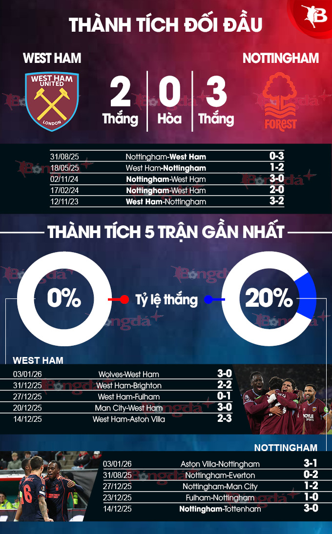 Trên sân nhà, West Ham cũng chỉ thắng 2/6 trận vừa qua còn Nottingham nhỉnh hơn chút khi thắng 3/6 trận sân khách vừa xong. Tuy vậy, West Ham vẫn có điểm tựa để tin sẽ giành điểm ở trận này khi họ bất phân thắng bại với Nottingham ở 10 lần chạm trán vừa qua khi mỗi đội thắng 5 trận.