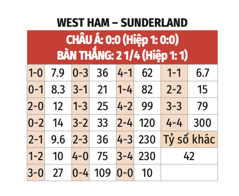 - Tối thiểu 1 bàn hiệp 1: 15/20 trận gần nhất của West Ham có tối thiểu 1 lần lưới rung hiệp 1. 4/5 trận gần nhất của Sunderland có kịch bản tương tự. NHM nên đợi sau 15 phút đầu rồi tin tưởng tỷ lệ nhiều bàn hiệp 1.