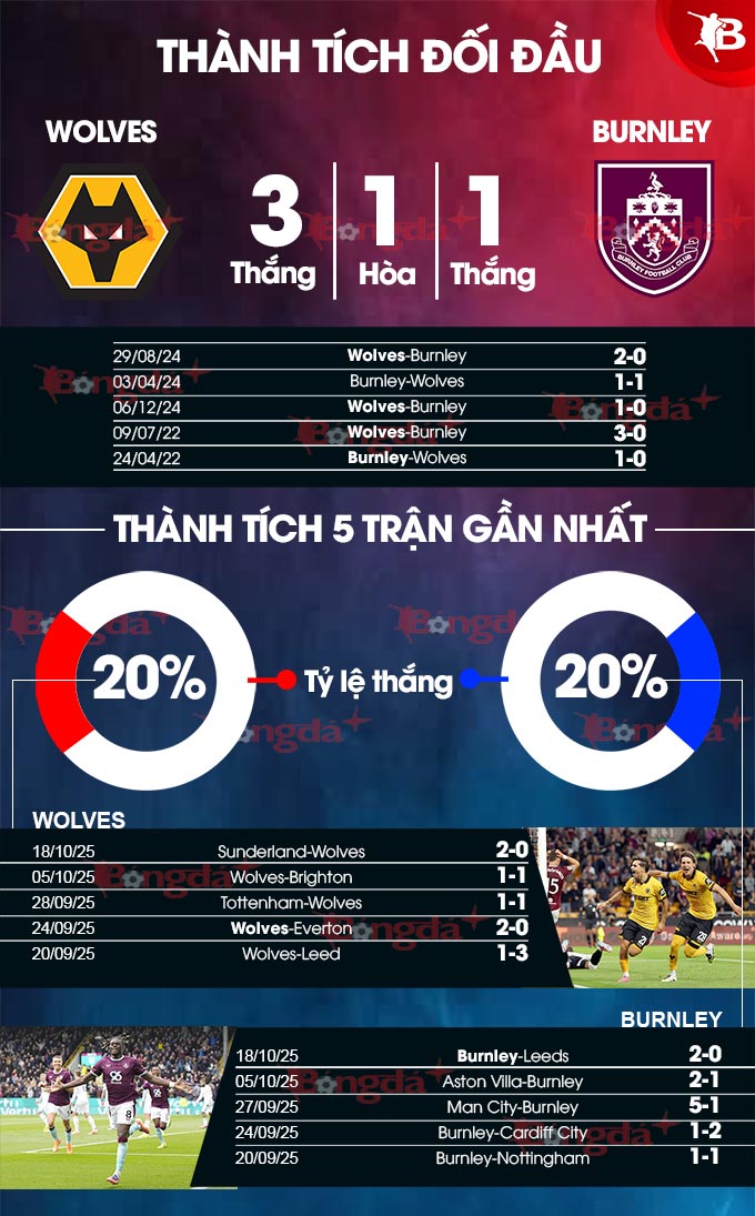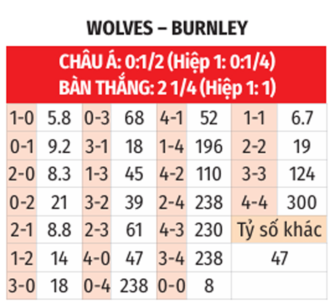 Chiều ngược lại, Burnley toàn thua trên sân khách kể từ khi Ngoại hạng Anh 2025/26 khởi tranh. Chưa hết, thành tích đối đầu giữa 2 CLB gần đây có phần nghiêng về Wolves khi bất bại ở 4 trận so tài vừa qua (thắng 3, hòa 1). Do đó, khả năng, Wolves sẽ có niềm vui.