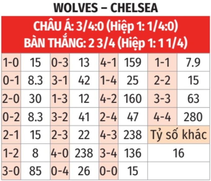 - Tối đa 1 bàn hiệp 1: 4/5 lần chạm trán giữa 2 đội gần đây trên sân của Wolves tại giải Ngoại hạng Anh đều chỉ có tối đa 1 bàn thắng trong hiệp 1. Tình trạng tương tự xảy ra ở 5/7 trận sân nhà gần đây của Wolves và 8/10 trận gần nhất của Chelsea.