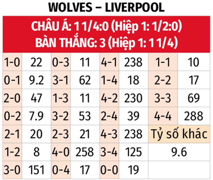- Tối đa 1 bàn hiệp 1: 5 trận liên tiếp gần đây của Wolves chỉ xuất hiện 1 bàn thắng trong hiệp đầu tiên. 9/10 trận sân khách vừa qua của Liverpool cũng có nhiều nhất 1 bàn trước giờ nghỉ, với 7 trận hòa 0-0. Chưa kể, 12/13 trận đối đầu gần nhất trên sân Molineux cũng chi có không quá 1 bàn trong 45 phút đầu.