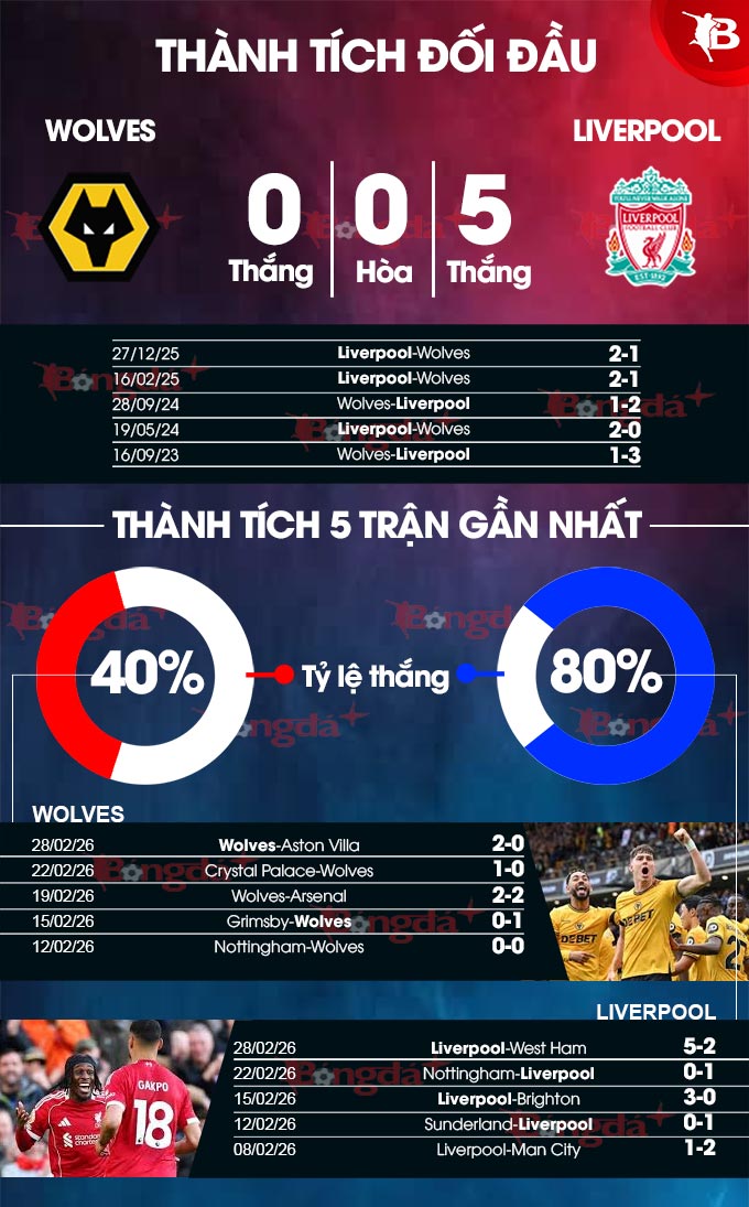 Liverpool hy vọng sẽ kéo dài chuỗi trận thắng trước Wolves lên 7 trận, mặc dù cả 3 chiến thắng gần nhất của họ đều là những trận đấu có tỷ số sít sao 2-1, gồm cả trận lượt đi hồi tháng 12/2025. Đội bóng của HLV Arne Slot dường như đã vượt qua những khó khăn khi giành chiến thắng 6 trong 7 trận gần nhất. Phong độ sân khách của Liverpool nhìn chung cũng khá tích cực, khi chỉ thua 1 trong 10 trận gần đây.