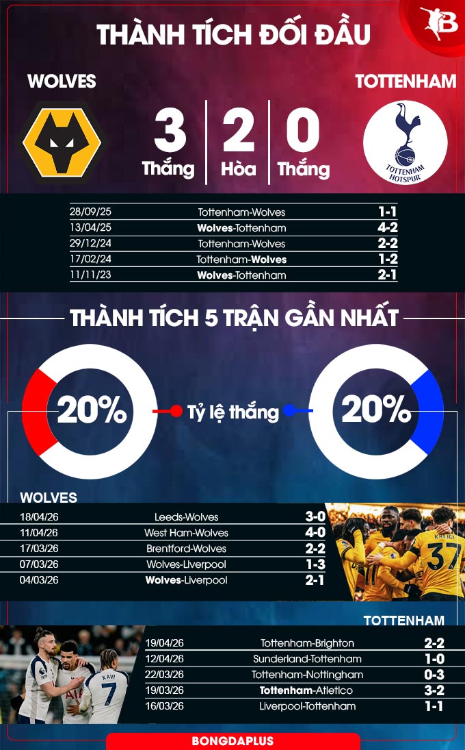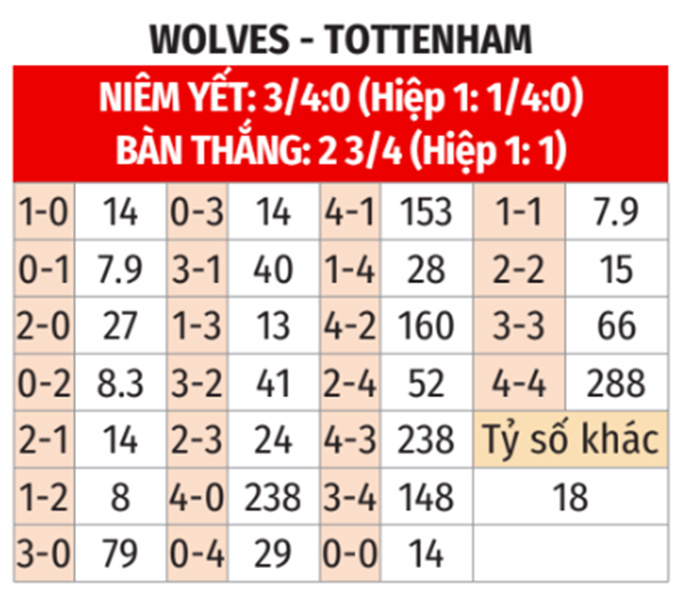 - Từ 3 bàn trở lên: 4/5 cuộc đối đầu gần nhất, cả 5 trận vừa qua của Wolves và 8/10 trận gần đây của Tottenham đều có ít nhất 3 bàn cả trận. Không những thế, 4/5 trận sân nhà gần nhất của Wolves cũng chứng kiến ít nhất 3 lần lưới rung cả trận.