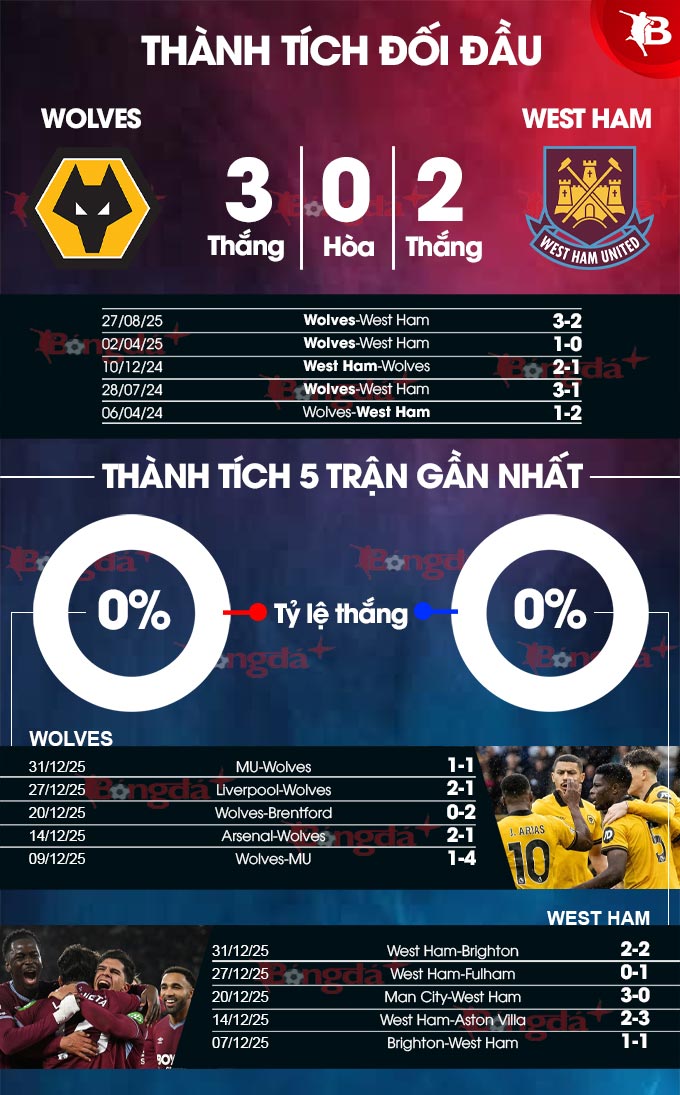 Tuy đã lâu không thắng ở giải Ngoại hạng Anh, song gần đây Wolves cũng đã cho thấy được sự khởi sắc. Nếu cứ đá tốt như những gì vừa thể hiện trước Liverpool và MU, sẽ chẳng bất ngờ nếu Bầy sói kiếm được trọn vẹn 3 điểm từ tay West Ham đang khủng hoảng.