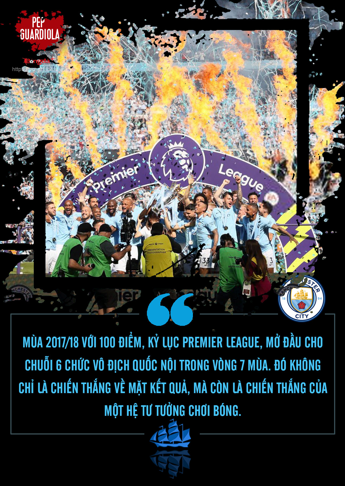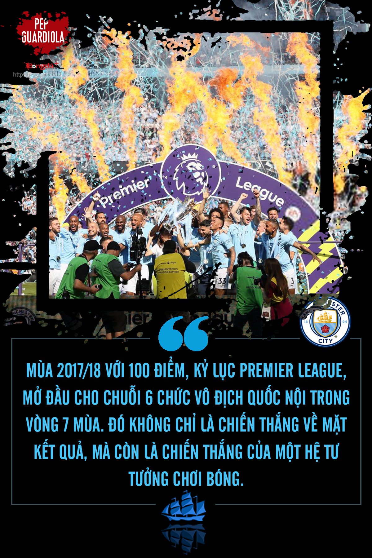 Chỉ trong vài mùa giải, Man City trở thành cỗ máy chiến thắng gần như hoàn hảo. Mùa 2017/18 với 100 điểm là cột mốc lịch sử, không chỉ vì con số tròn trịa, mà vì cách họ đạt được nó: áp đảo gần như mọi đối thủ bằng thứ bóng đá có tổ chức cao, linh hoạt và tàn nhẫn. Các hậu vệ biên bó vào trong như tiền vệ, trung vệ dâng cao tham gia điều phối, tiền đạo lùi sâu kéo giãn hàng thủ – những khái niệm trước đây còn xa lạ với phần đông khán giả Anh nay trở thành điều quen thuộc mỗi cuối tuần.