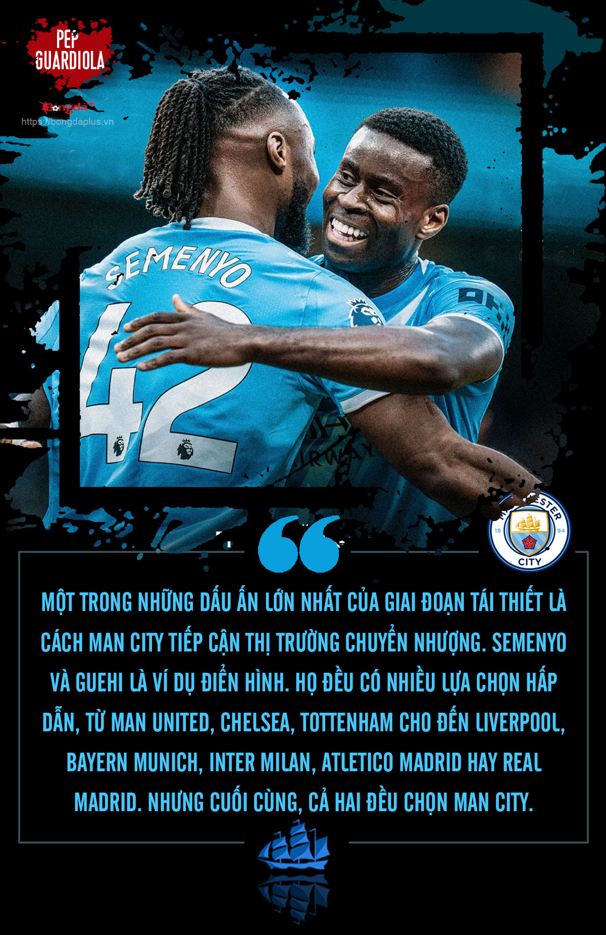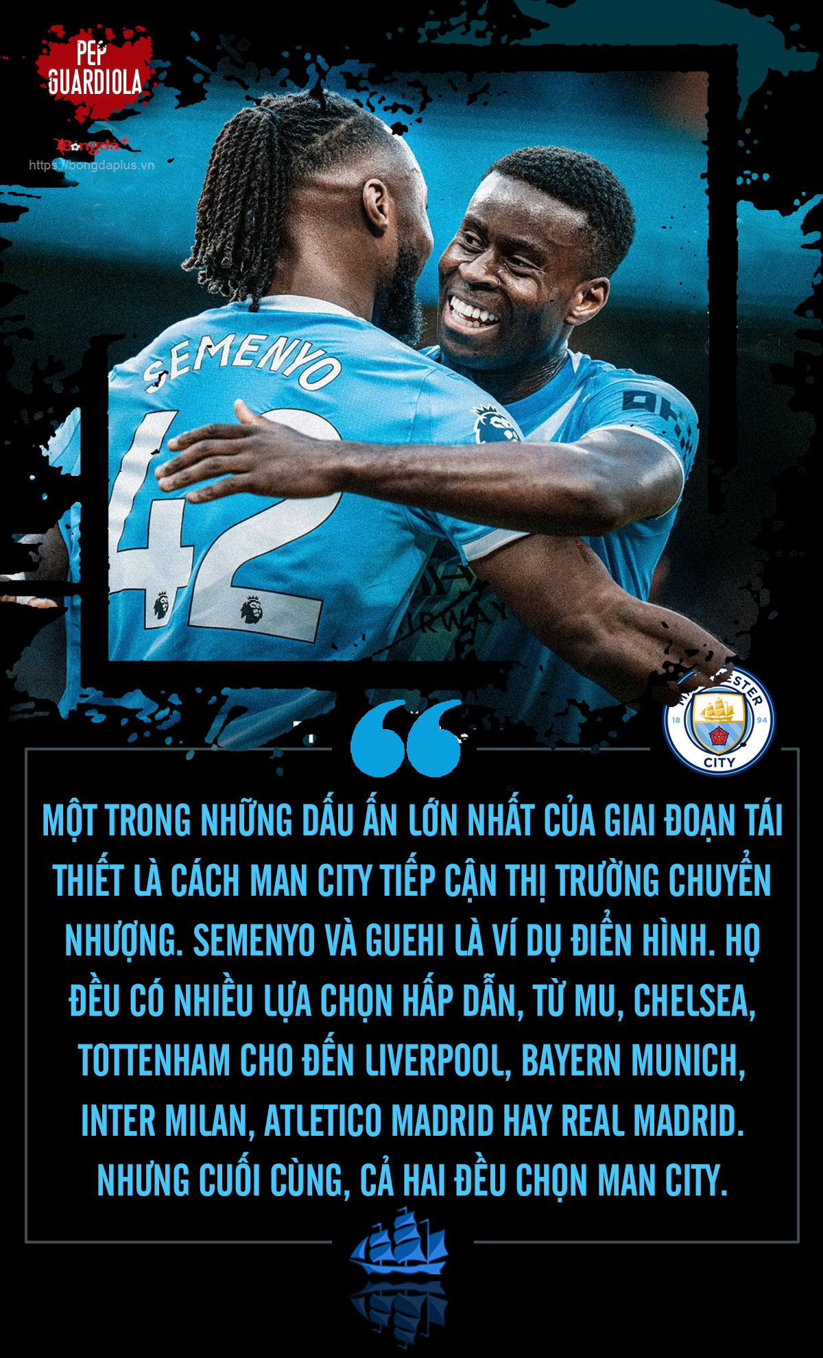 Mùa Đông năm 2026, Man City khiến người ta chú ý không chỉ bởi những bản hợp đồng nổi bật như Antoine Semenyo hay Marc Guehi, mà chính bởi bản chất của những thương vụ ấy. Họ không đến vì Pep, mà đến dù có Pep hay không Pep.