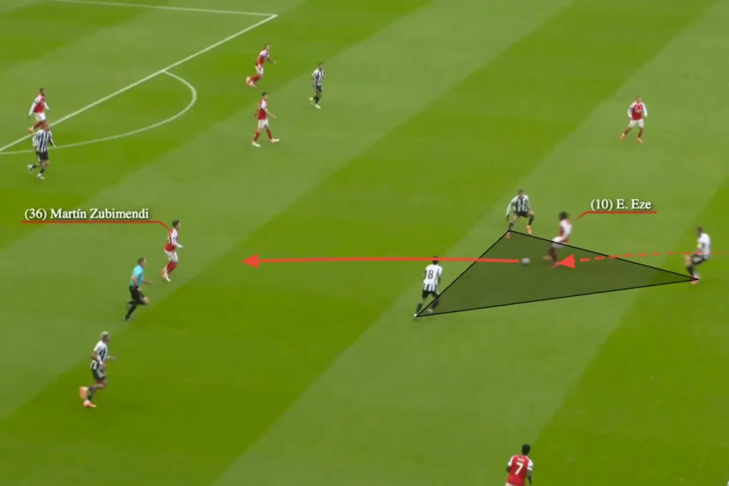 Dưới thời Arteta, lối chuyền bóng của Arsenal từng trở nên quá chậm và dễ đoán mỗi khi đối thủ giữ đội hình chặt ở khu giữa sân mùa trước. Họ gặp khó trong việc đưa bóng lên phía trước một cách nhanh và hiệu quả. Nhưng mùa này, Arsenal đã sử dụng cá
