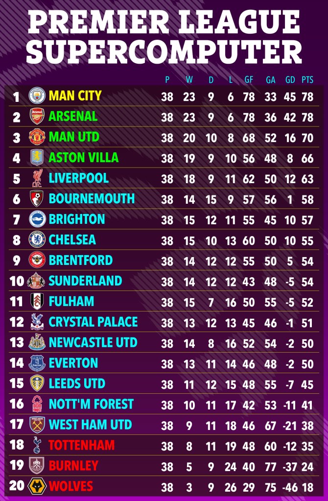 Mỗi đội đang cạnh tranh chức vô địch sẽ giành thêm 8 điểm, tương đương với 2 chiến thắng, 2 trận hòa và 1 trận thua. Nếu đúng như máy tính dự đoán, cả hai đội sẽ cùng kết thúc với 78 điểm và cần hiệu số bàn thắng bại để phân định ngôi vị số một trên bảng xếp hạng. Siêu máy tính dự đoán rằng mỗi đội sẽ kết thúc mùa giải với 78 bàn thắng.