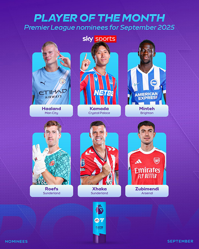 Bên cạnh Martin Zubimendi, danh sách đề còn có Daichi Kamada (Crystal Palace), Yankuba Minteh (Brighton), Robin Roefs (Sunderland), Granit Xhaka (Sunderland) và Erling Haaland (Man City). Xhaka chắc chắn là cái tên gây bất ngờ nhất. Cựu thủ quân bị xem là tệ nhất lịch sử Arsenal đang chơi cực hay ở Sunderland và được xem là cảm hứng để giúp tân binh mùa này "bay cao" trên BXH.