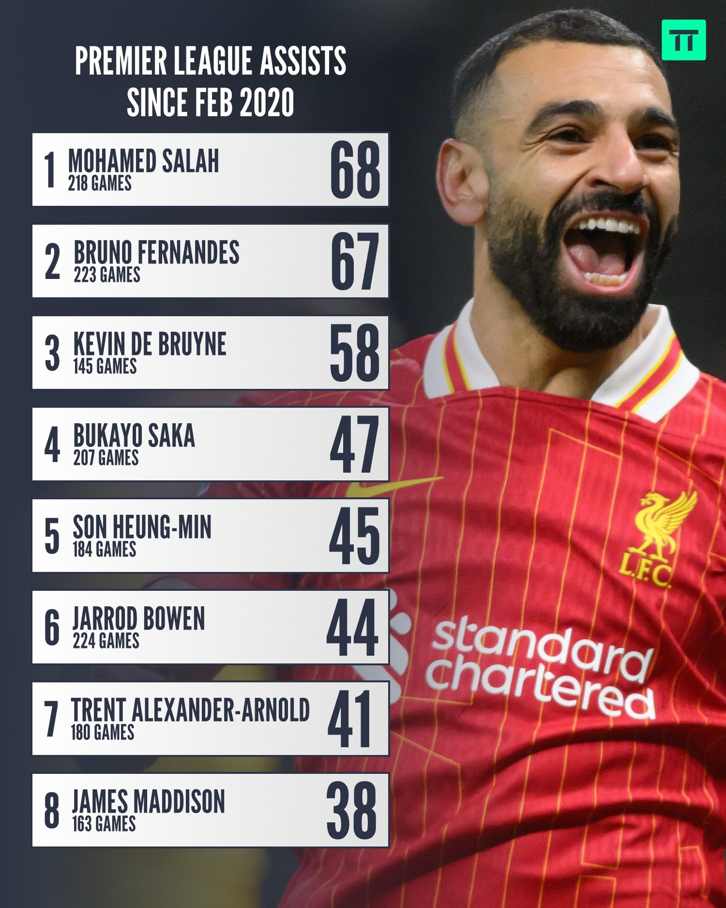 Đứng thứ 3 trong danh sách kiến tạo Premier League kể từ khi Fernandes ra mắt Premier League là Kevin de Bruyne với 58 kiến tạo sau 145 trận. Các vị trí tiếp theo trong Top 10 là Bukayo Saka (47), Son Heung-min (45), Jarrod Bowen (44), Trent Alexander-Arnold (41), James Maddison (38), Martin Odegaard (36) và Bernardo Silva (35).