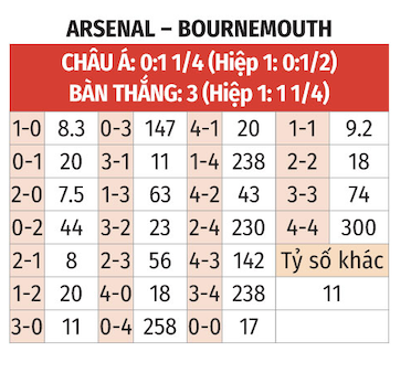 - Cả 2 đội ghi bàn: Hai lần đụng độ gần nhất của 2 đội có hiện tượng cả 2 đội cùng ghi được bàn thắng. 4/6 trận gần nhất của Arsenal ở Premier League cũng có hiện tượng lưới rung ở cả 2 đầu khung thành. 7/10 trận sân khách gần nhất của Bournemouth cũng xuất hiện việc cả 2 đội ghi bàn. Trận này lưới sẽ rung cả 2 đầu khung thành.