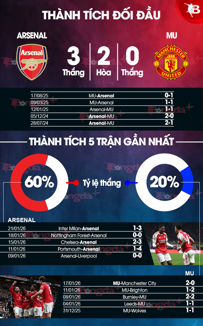- Hai đội cùng ghi bàn: 4/5 trận vừa qua của MU đều không có đội "tịt ngòi". 3/4 trận gần đây của Arsenal cũng không có đội nào thành công trong việc giữ sạch lưới.